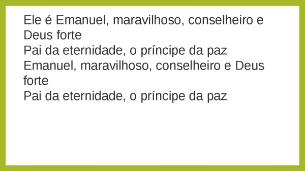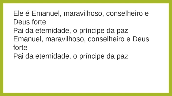 - Ele é Emanuel, maravilhoso, conselheiro e Deus fortePai da eternidade, o príncipe da pazEmanuel, maravilhoso, conselheiro e Deus fortePai da eternidade, o príncipe da paz
