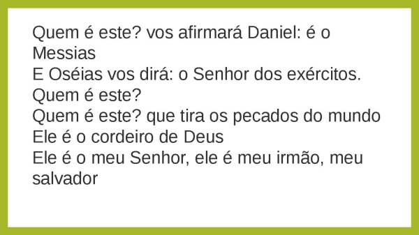 - Quem é este? vos afirmará Daniel: é o MessiasE Oséias vos dirá: o Senhor dos exércitos.Quem é este?Quem é este? que tira os pecados do mundoEle é o cordeiro de DeusEle é o meu Senhor, ele é meu irmão, meu salvador