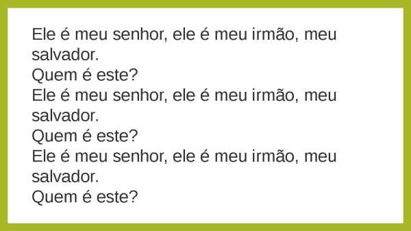 - Ele é meu senhor, ele é meu irmão, meu salvador.Quem é este?Ele é meu senhor, ele é meu irmão, meu salvador.Quem é este?Ele é meu senhor, ele é meu irmão, meu salvador.Quem é este?