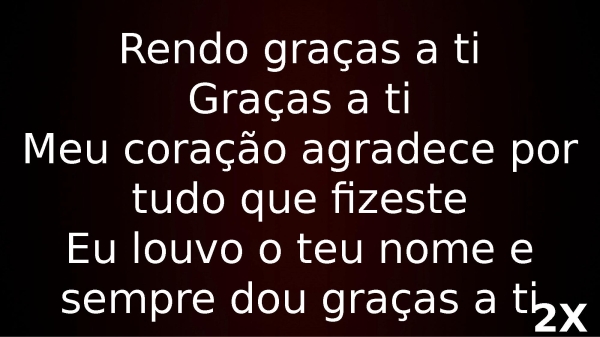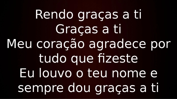 - Rendo graças a tiGraças a tiMeu coração agradece por tudo que fizesteEu louvo o teu nome e sempre dou graças a ti2X