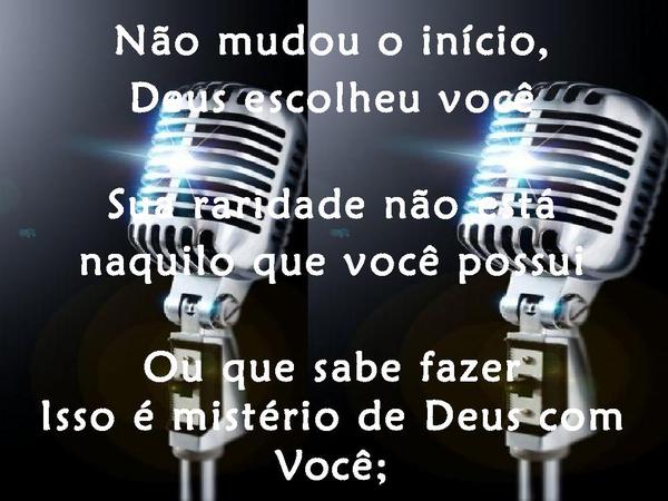 - Não mudou o início,Deus escolheu vocêSua raridade não estánaquilo que você possuiOu que sabe fazerIsso é mistério de Deus com Você;