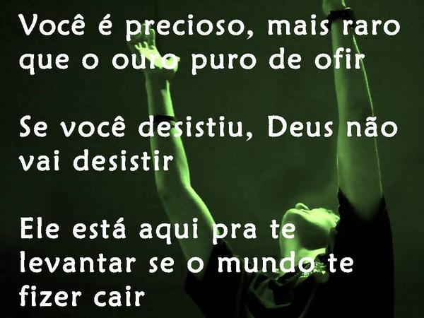 - Você é precioso, mais raro que o ouro puro de ofirSe você desistiu, Deus não vai desistirEle está aqui pra te levantar se o mundo te fizer cair