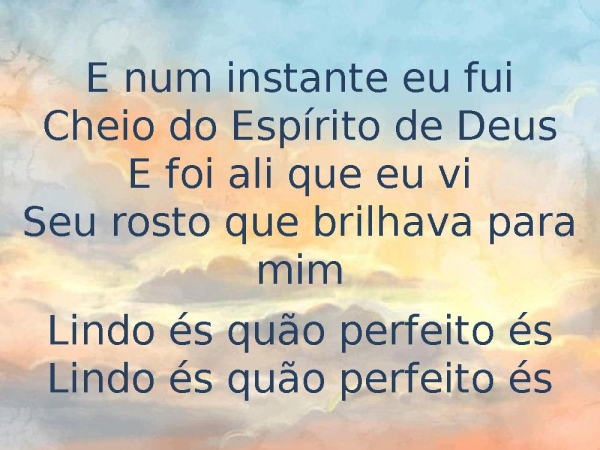 - E num instante eu fuiCheio do Espírito de DeusE foi ali que eu viSeu rosto que brilhava para mimLindo és quão perfeito ésLindo és quão perfeito és