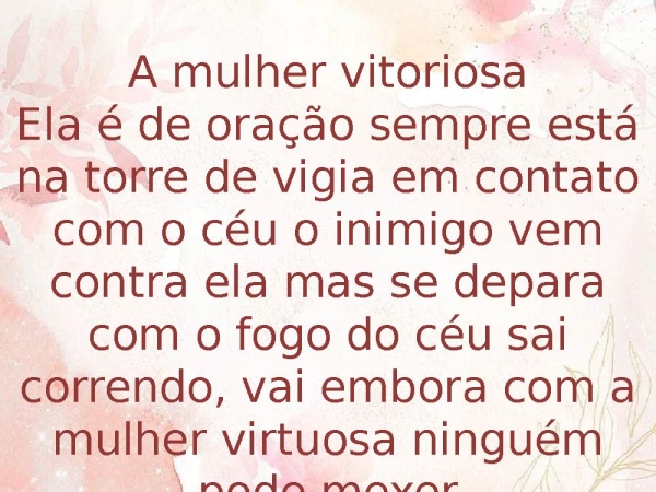 - A mulher vitoriosaEla é de oração sempre está na torre de vigia em contato com o céu o inimigo vem contra ela mas se depara com o fogo do céu sai correndo, vai embora com a mulher virtuosa ninguém pode mexer