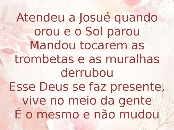 - Atendeu a Josué quando orou e o Sol parouMandou tocarem as trombetas e as muralhas derrubouEsse Deus se faz presente, vive no meio da genteÉ o mesmo e não mudou