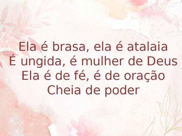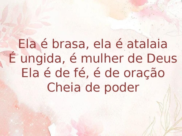 - Ela é brasa, ela é atalaiaÉ ungida, é mulher de DeusEla é de fé, é de oraçãoCheia de poder