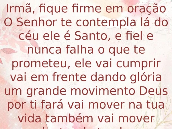 - Irmã, fique firme em oraçãoO Senhor te contempla lá do céu ele é Santo, e fiel e nunca falha o que te prometeu, ele vai cumprir vai em frente dando glória um grande movimento Deus por ti fará vai mover na tua vida também vai mover dentro do teu lar