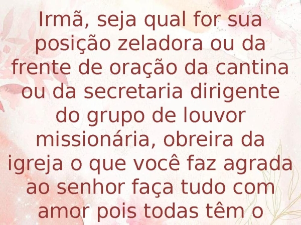 - Irmã, seja qual for sua posição zeladora ou da frente de oração da cantina ou da secretaria dirigente do grupo de louvor missionária, obreira da igreja o que você faz agrada ao senhor faça tudo com amor pois todas têm o mesmo valor