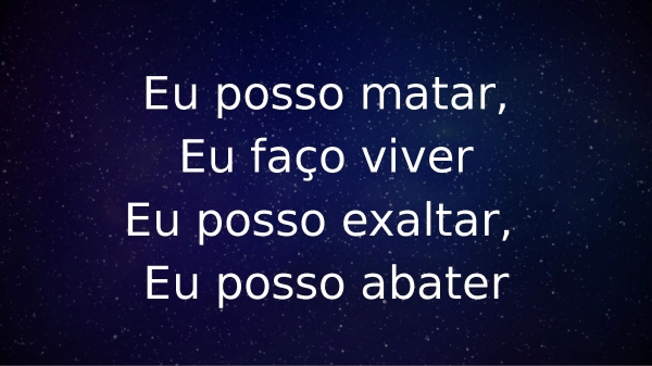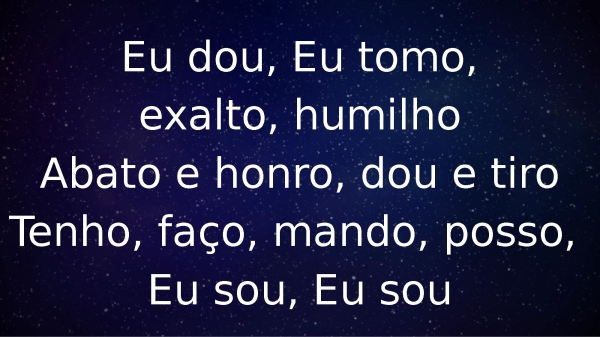 - Eu dou, Eu tomo,exalto, humilhoAbato e honro, dou e tiroTenho, faço, mando, posso, Eu sou, Eu sou