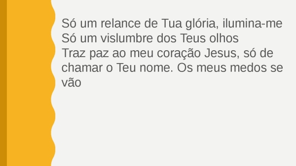 - Só um relance de Tua glória, ilumina-meSó um vislumbre dos Teus olhosTraz paz ao meu coração Jesus, só de chamar o Teu nome. Os meus medos se vão