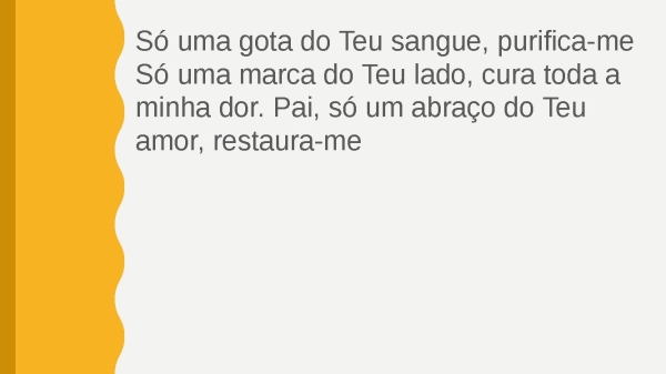 - Só uma gota do Teu sangue, purifica-meSó uma marca do Teu lado, cura toda a minha dor. Pai, só um abraço do Teu amor, restaura-me