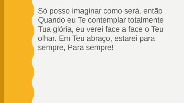 - Só posso imaginar como será, entãoQuando eu Te contemplar totalmenteTua glória, eu verei face a face o Teu olhar. Em Teu abraço, estarei para sempre, Para sempre!