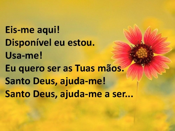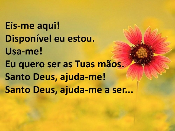 - Eis-me aqui!Disponível eu estou.Usa-me!Eu quero ser as Tuas mãos.Santo Deus, ajuda-me!Santo Deus, ajuda-me a ser...