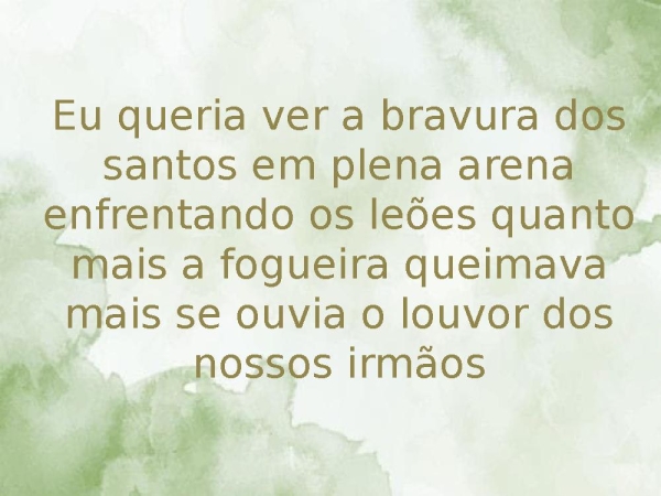 - Eu queria ver a bravura dos santos em plena arena enfrentando os leões quanto mais a fogueira queimava mais se ouvia o louvor dos nossos irmãos