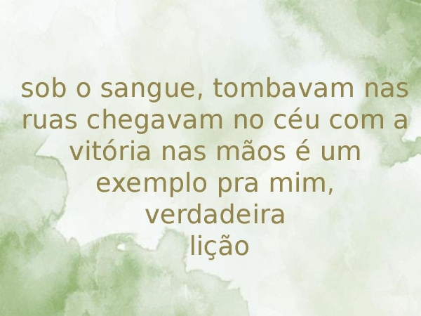 - sob o sangue, tombavam nas ruas chegavam no céu com a vitória nas mãos é um exemplo pra mim, verdadeira lição
