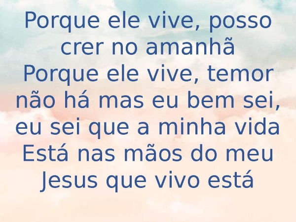 - Porque ele vive, posso crer no amanhãPorque ele vive, temor não há mas eu bem sei, eu sei que a minha vidaEstá nas mãos do meu Jesus que vivo está