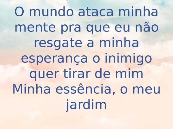 - O mundo ataca minha mente pra que eu não resgate a minha esperança o inimigo quer tirar de mimMinha essência, o meu jardim