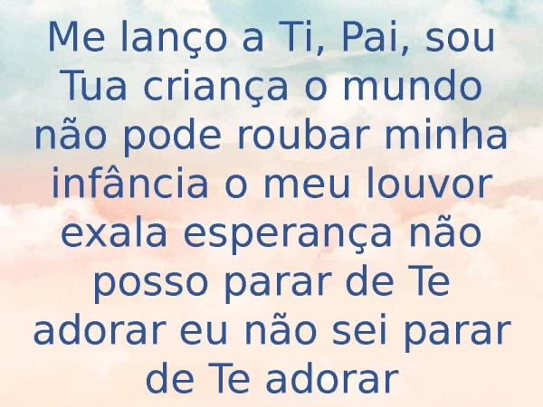 - Me lanço a Ti, Pai, sou Tua criança o mundo não pode roubar minha infância o meu louvor exala esperança não posso parar de Te adorar eu não sei parar de Te adorar
