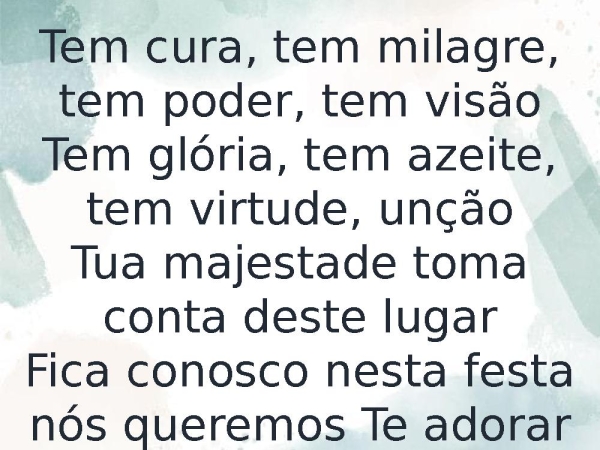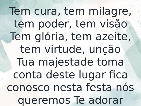 - Tem cura, tem milagre, tem poder, tem visãoTem glória, tem azeite, tem virtude, unçãoTua majestade toma conta deste lugar fica conosco nesta festa nós queremos Te adorar