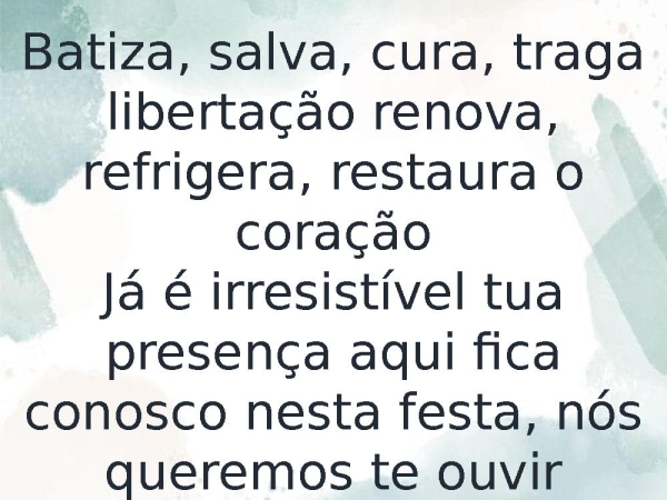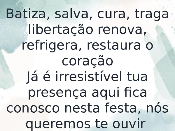- Batiza, salva, cura, traga libertação renova, refrigera, restaura o coraçãoJá é irresistível tua presença aqui fica conosco nesta festa, nós queremos te ouvirTe ouvir