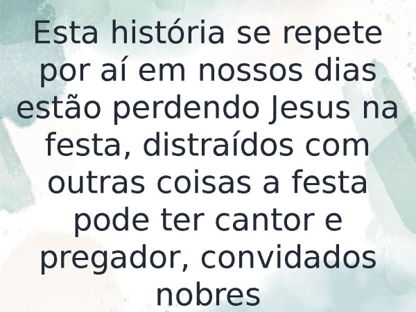 - Esta história se repete por aí em nossos dias estão perdendo Jesus na festa, distraídos com outras coisas a festa pode ter cantor e pregador, convidados nobres