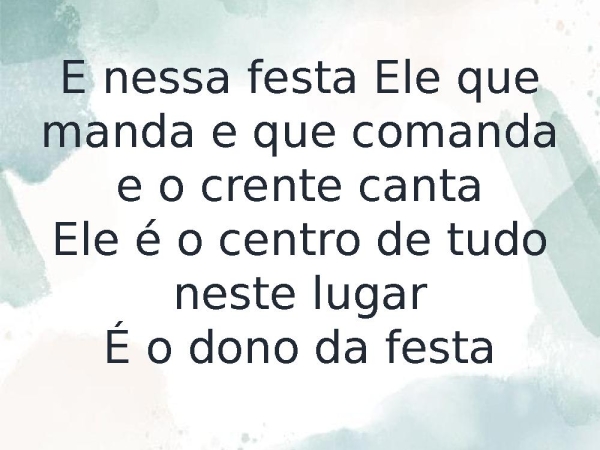 - E nessa festa Ele que manda e que comanda e o crente cantaEle é o centro de tudo neste lugarÉ o dono da festa