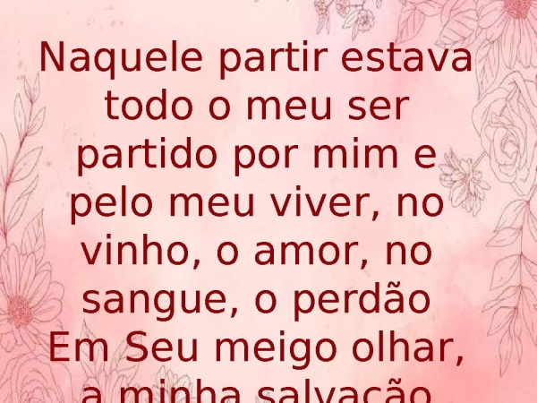 - Naquele partir estava todo o meu ser partido por mim e pelo meu viver, no vinho, o amor, no sangue, o perdãoEm Seu meigo olhar, a minha salvação