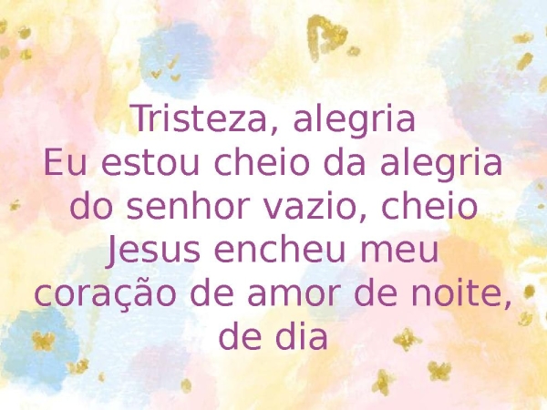 - Tristeza, alegriaEu estou cheio da alegria do senhor vazio, cheioJesus encheu meu coração de amor de noite, de dia
