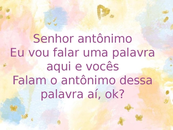 - Senhor antônimoEu vou falar uma palavra aqui e vocêsFalam o antônimo dessa palavra aí, ok?