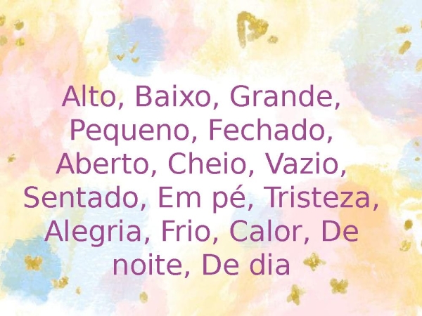 - Alto, Baixo, Grande, Pequeno, Fechado, Aberto, Cheio, Vazio, Sentado, Em pé, Tristeza, Alegria, Frio, Calor, De noite, De dia
