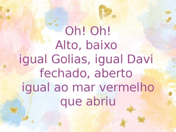 - Oh! Oh!Alto, baixo igual Golias, igual Davi fechado, aberto igual ao mar vermelho que abriu