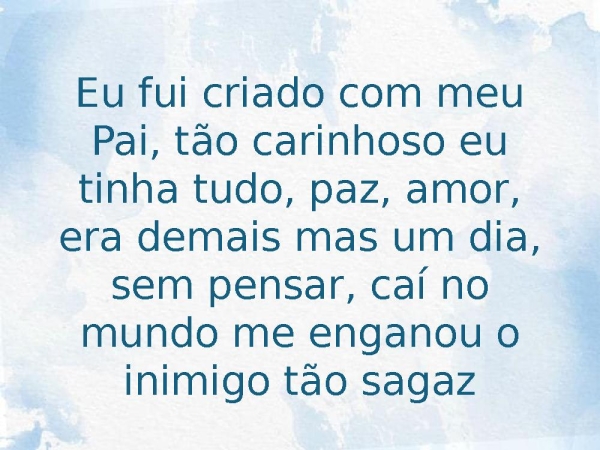 - Eu fui criado com meu Pai, tão carinhoso eu tinha tudo, paz, amor, era demais mas um dia, sem pensar, caí no mundo me enganou o inimigo tão sagaz