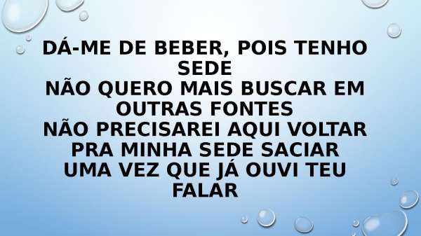 - Dá-me de beber, pois tenho sedeNão quero mais buscar em outras fontesNão precisarei aqui voltar pra minha sede saciarUma vez que já ouvi teu falar