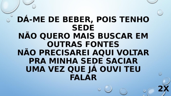 - Dá-me de beber, pois tenho sedeNão quero mais buscar em outras fontesNão precisarei aqui voltar pra minha sede saciarUma vez que já ouvi teu falar2X