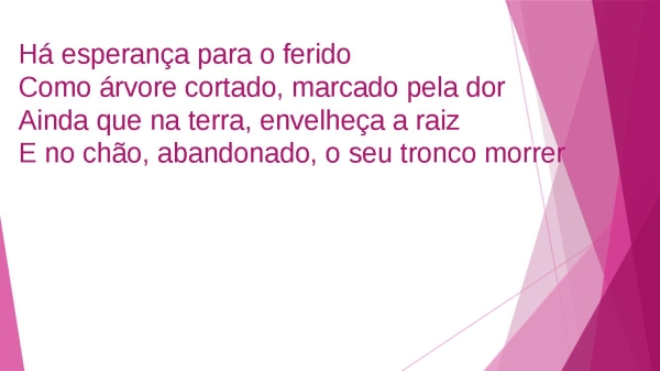- Há esperança para o feridoComo árvore cortado, marcado pela dorAinda que na terra, envelheça a raizE no chão, abandonado, o seu tronco morrer