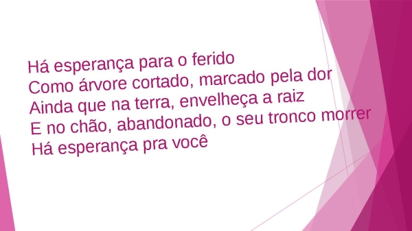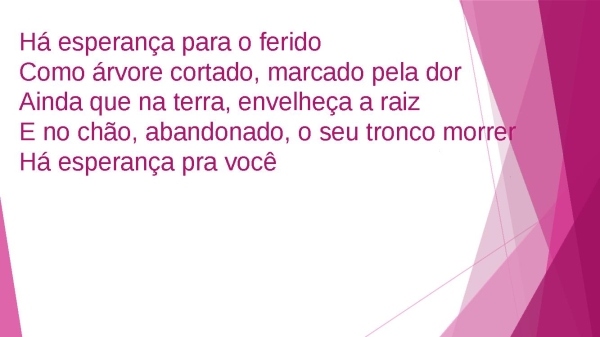 - Há esperança para o feridoComo árvore cortado, marcado pela dorAinda que na terra, envelheça a raizE no chão, abandonado, o seu tronco morrerHá esperança pra você