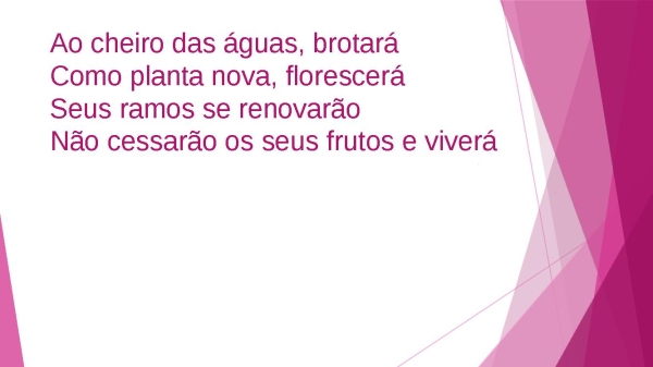 - Ao cheiro das águas, brotaráComo planta nova, floresceráSeus ramos se renovarãoNão cessarão os seus frutos e viverá
