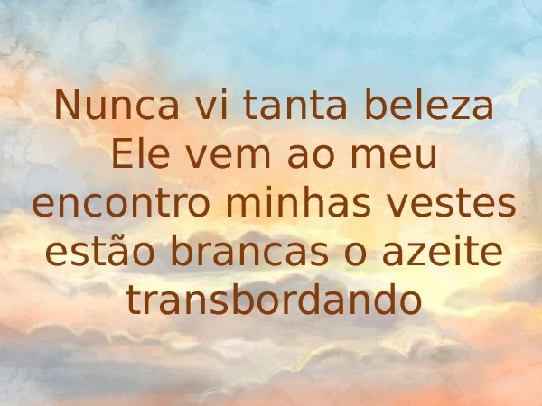 - Nunca vi tanta belezaEle vem ao meu encontro minhas vestes estão brancas o azeite transbordando