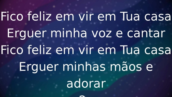 - Fico feliz em vir em Tua casaErguer minha voz e cantarFico feliz em vir em Tua casaErguer minhas mãos e adorar2x