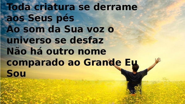 - Todo ser que vive louve o nome do Senhor Toda criatura se derrame aos Seus pés Ao som da Sua voz o universo se desfaz Não há outro nome comparado ao Grande Eu Sou