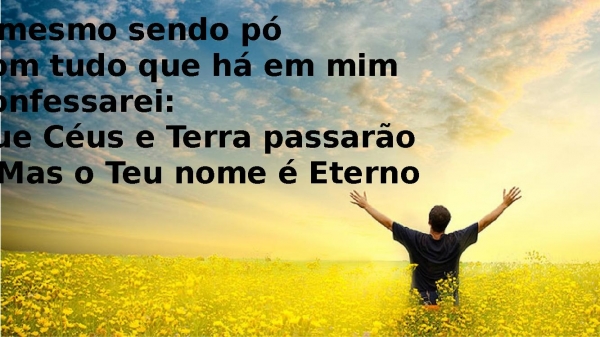 - E mesmo sendo pó Com tudo que há em mim Confessarei: Que Céus e Terra passarão Mas o Teu nome é Eterno