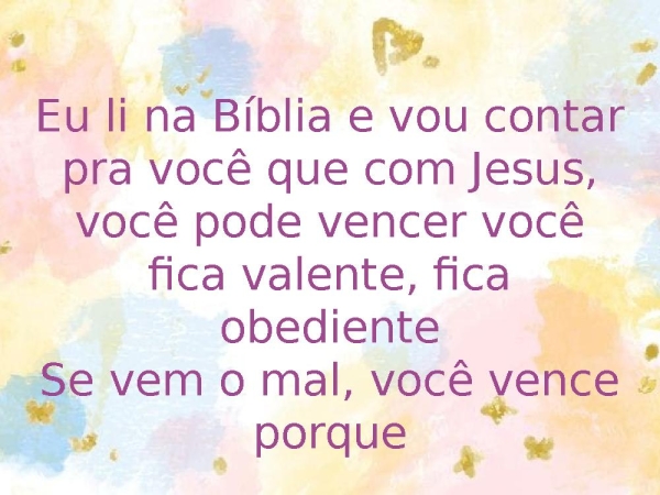 - Eu li na Bíblia e vou contar pra você que com Jesus, você pode vencer você fica valente, fica obedienteSe vem o mal, você vence porque