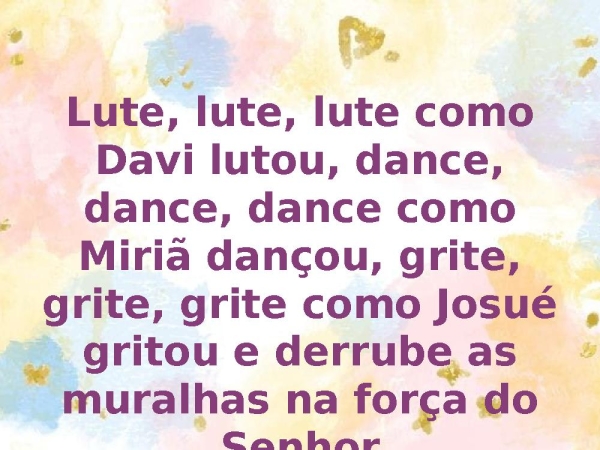 - Lute, lute, lute como Davi lutou, dance, dance, dance como Miriã dançou, grite, grite, grite como Josué gritou e derrube as muralhas na força do Senhor