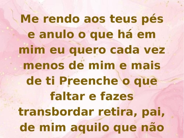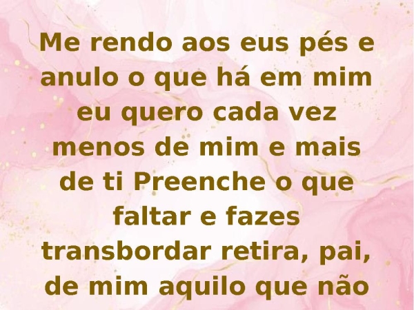- Me rendo aos teus pés e anulo o que há em mim eu quero cada vez menos de mim e mais de ti Preenche o que faltar e fazes transbordar retira, pai, de mim aquilo que não te agradar