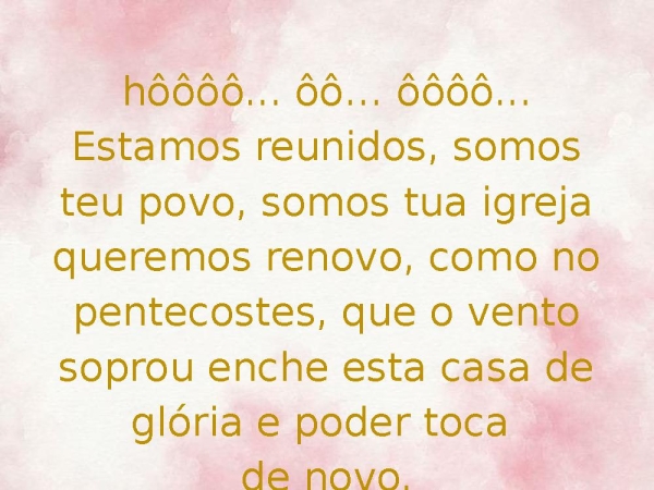 - hôôôô... ôô… ôôôô... Estamos reunidos, somos teu povo, somos tua igreja queremos renovo, como no pentecostes, que o vento soprou enche esta casa de glória e poder toca de novo.