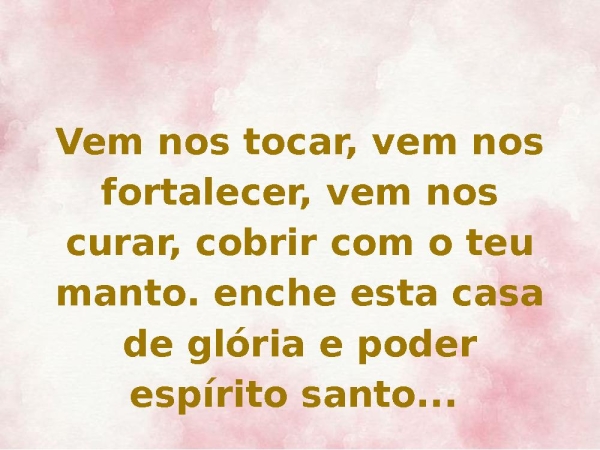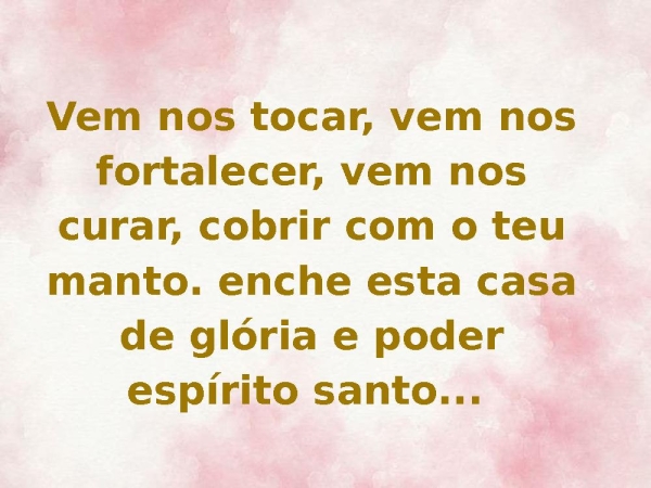 - Vem nos tocar, vem nos fortalecer, vem nos curar, cobrir com o teu manto. enche esta casa de glória e poder espírito santo...