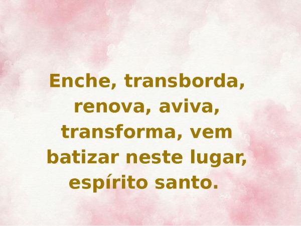- Enche, transborda, renova, aviva, transforma, vem batizar neste lugar, espírito santo.