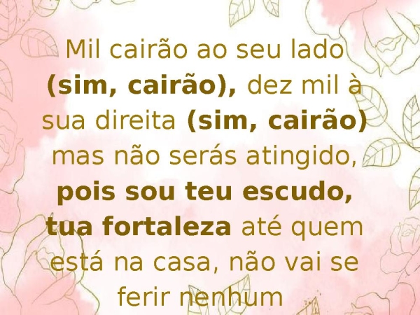 - Mil cairão ao seu lado (sim, cairão), dez mil à sua direita (sim, cairão) mas não serás atingido, pois sou teu escudo, tua fortaleza até quem está na casa, não vai se ferir nenhum