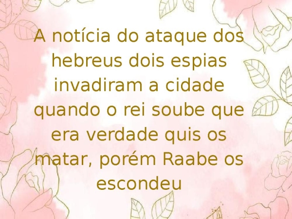 - A notícia do ataque dos hebreus dois espias invadiram a cidade quando o rei soube que era verdade quis os matar, porém Raabe os escondeu