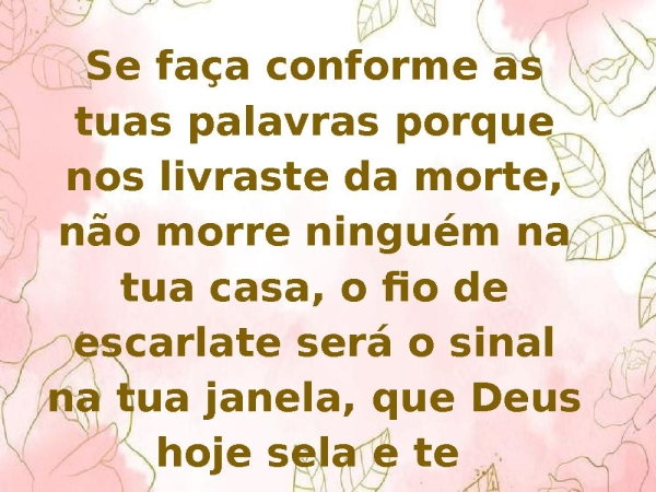 - Se faça conforme as tuas palavras porque nos livraste da morte, não morre ninguém na tua casa, o fio de escarlate será o sinal na tua janela, que Deus hoje sela e te livra do mal